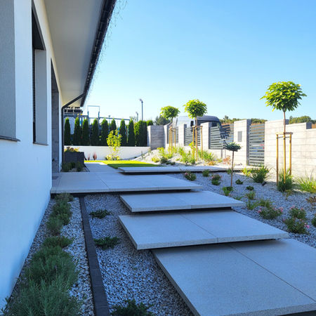 Skrajna prostota w ogrodzie to użycie kilku prostych elementów w celu otrzymania pożądanej i satysfakcjonującej kompozycji, która daje silny efekt wizualny. Dzięki temu można bardziej docenić kształt, formę i linię każdej przestrzeni, obiektu, czy rośliny. Pomoże w tym zastosowanie podzielonych nawierzchni, wykonanych na różnych poziomach, z kilku kontrastujących materiałów. Wzniesione, obmurowane rabaty podkreślą zróżnicowanie poziomów i jednocześnie będą doskonałym tłem dla przewisających przez nie roślin. Duża, otwarta przestrzeń pozwoli na łatwiejszy odbiór formy i pokroju nasadzeń.